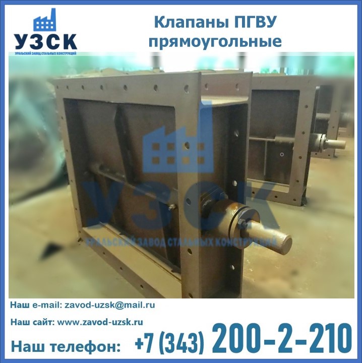 Прямоугольный клапан ПГВУ имеет прямоугольную или квадратную форму, по основному сечению конструкции, на которую устанавливается клапан. Для изготовления шиберов ПГВУ в Калуге применяются сталь нержавеющая, углеродистая или низколегированная, в зависимости от модели. Внутри клапана имеется запорный элемент, передвигающийся параллельно общему потоку движения среды. Запорный элемент, или створка имеет такую же форму, как и основное сечение. Перемещение створки происходит благодаря возвратно-поступательным движениям.